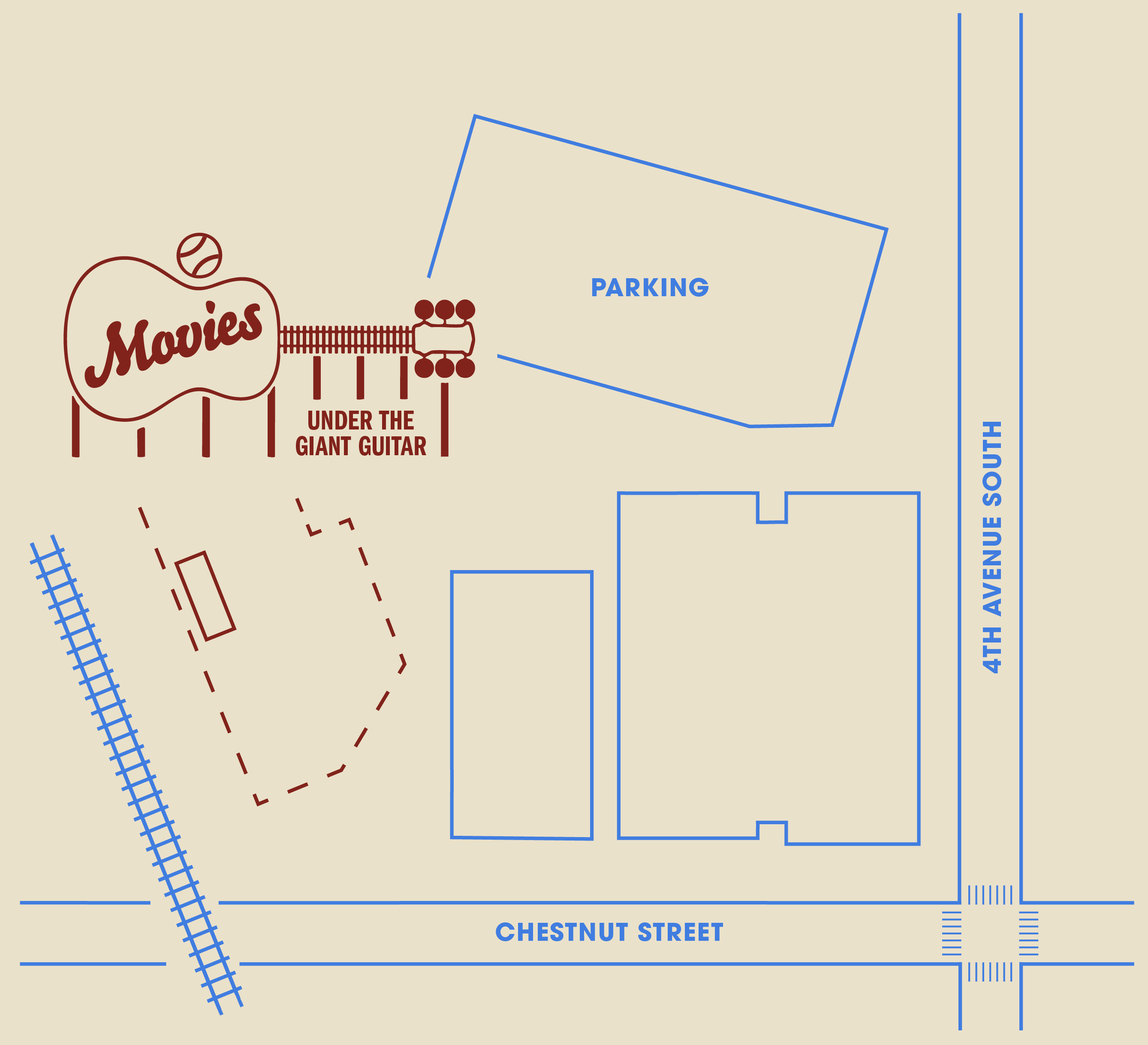 Located just behind Nashville Warehouse Co., at Chestnut & 4th, The Outfield is an acre of communal green space featuring the old Greer Stadium guitar-shaped scoreboard. Movies will be screened on the stage beneath the Giant Guitar, so set up chairs or a picnic blanket in The Outfield and enjoy the show!